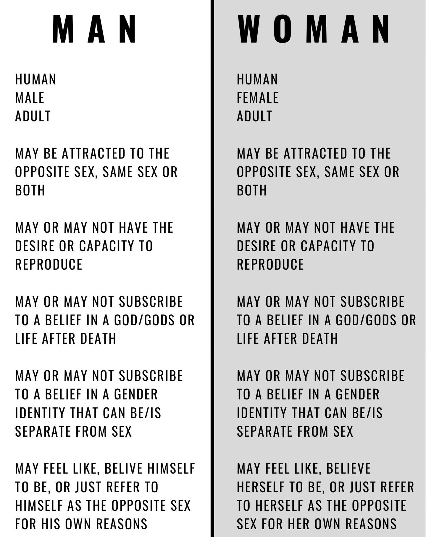 I made this graphic because we need to go back to the basics, black and white facts. You don’t have to be a philosophical scholar, doctor or activist of any kind to understand these categories. Notice how we mostly have stuff in common, can believe, do, be with, express ourselves how we like? But we are separate types, different “models” of humans on separate pathways. I think people get mixed-up about the fact that categorizing ourselves first starts with our immutable sex. Not what “gender” we identify ourselves with or how we feel about ourselves. This is what children should learn in school. What you do with this basic information afterwards is where we can talk about respect, kindness and how inclusion can work, like, third spaces, when, how and if we use preferred pronouns. Don’t get it twisted before that.